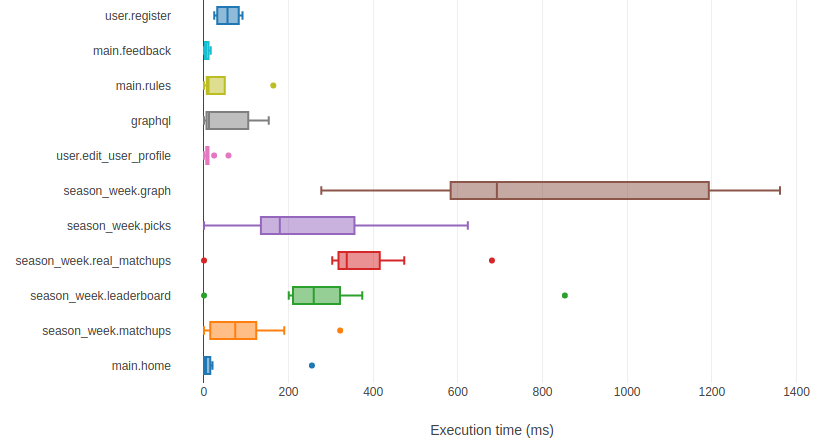 - This modularity made my query footprint a lot smaller. The all-picks view would query for all users but only one week, whereas the lb/graph would query for all users for all week. They used the same machinery underneath, but the latter called it in a loop. Now it queries all at once and reformats the data as desired after. I remember thinking about this inefficiency when I first wrote it, but didn’t have time to optimize. I do now.